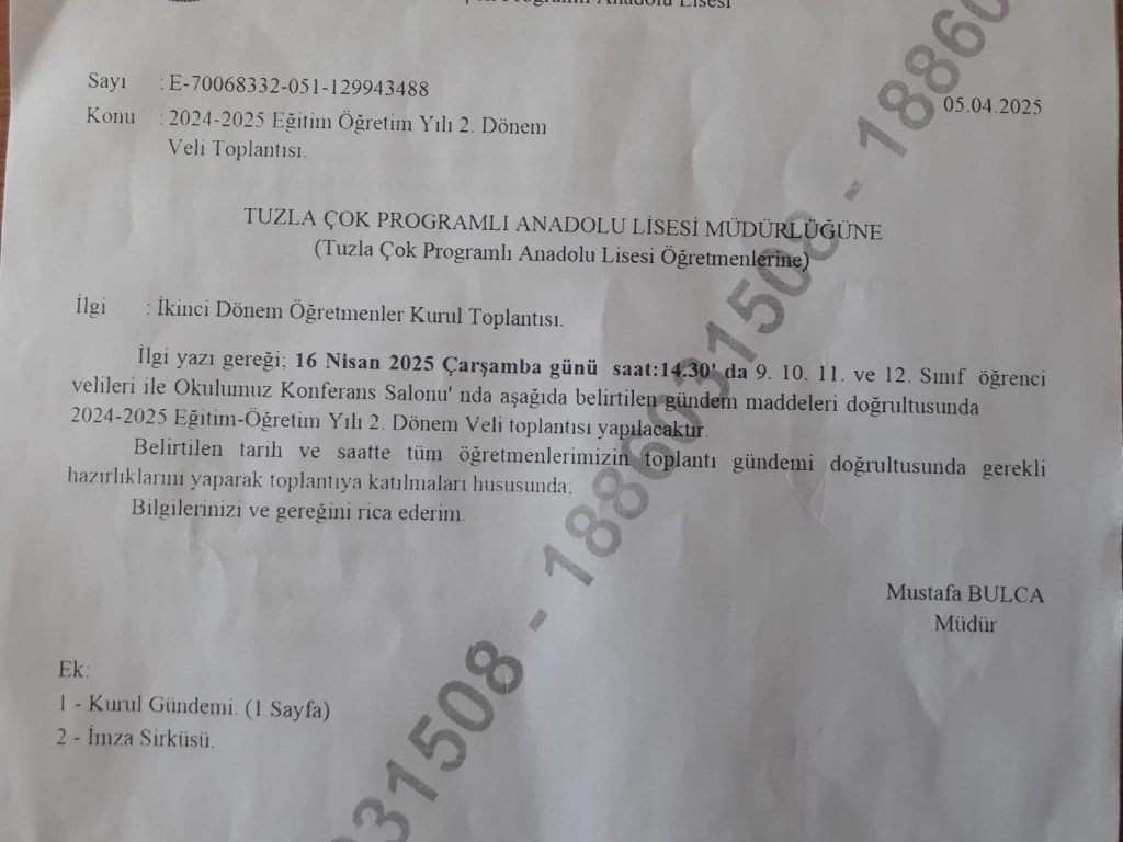16 Nisan 2025 Çarşamba saat 14.30'da tüm velilerimizi veli toplantımıza bekliyoruz. Toplantımızın resmi yazısı aşağıda sunulmuştur: